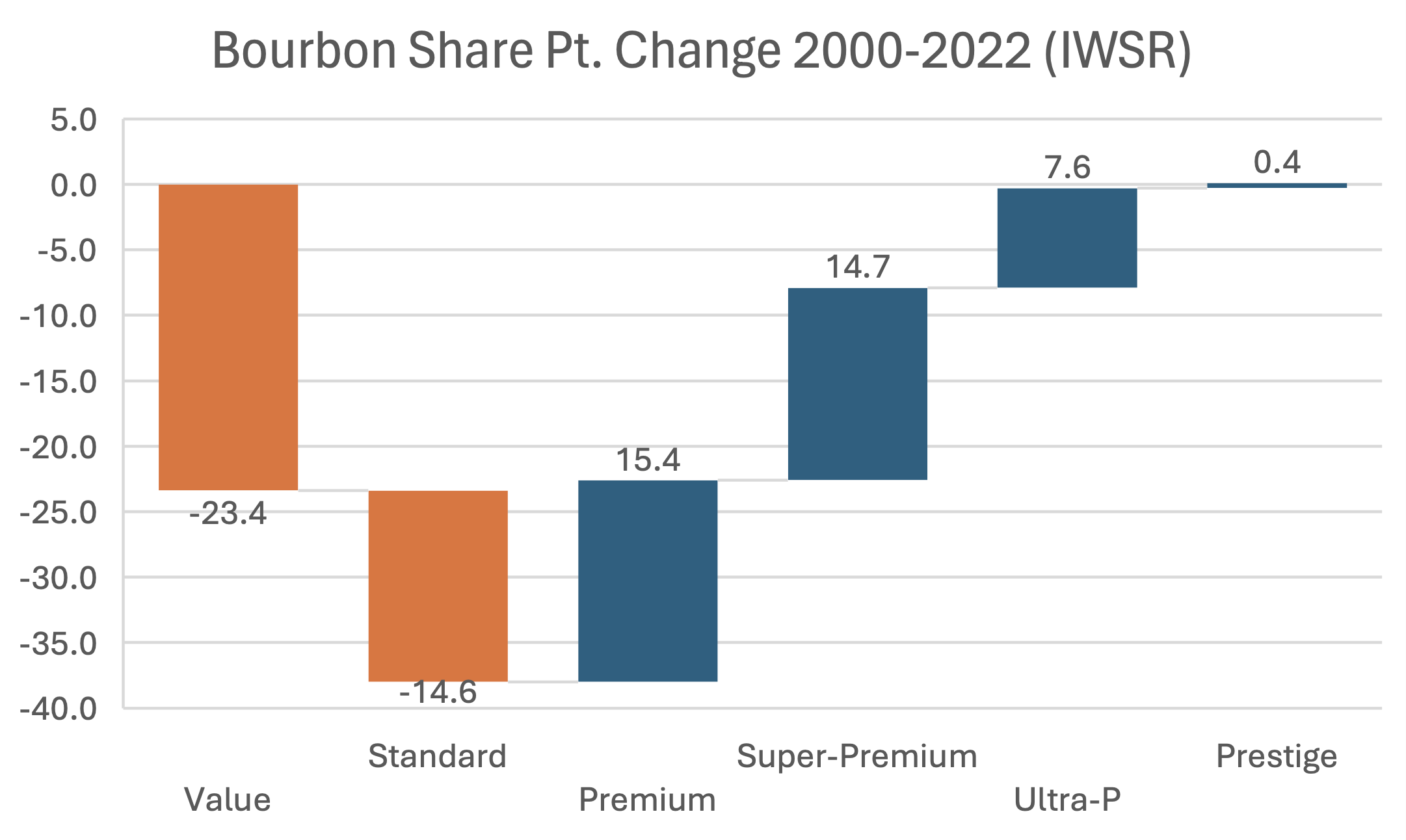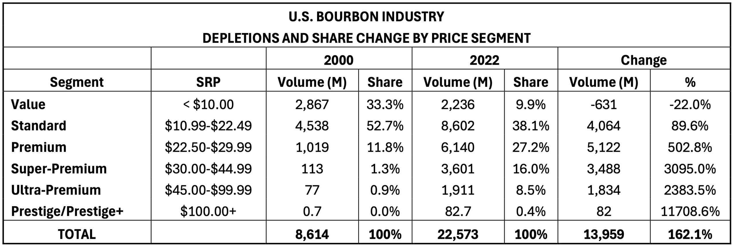 - Using the 80/20 rule, 86% of volume in 2000 was in the lower-priced Value and Standard price bands. 22 years later, 81% of bourbon volume sits in the Standard, Premium and Super-Premium price bands, with Standard price brands having lost 15 share points since 2000.